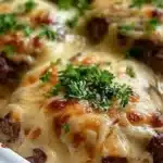 A comforting casserole featuring hearty hamburger steaks, caramelized onions, and a creamy gravy, perfect for weeknight dinners or family gatherings.