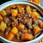 A hearty and comforting beef stew featuring fresh fall vegetables, perfect for cooler months.