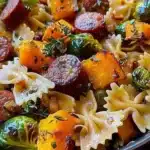 A cozy fall dish featuring roasted butternut squash, Brussels sprouts, and smoked sausage, all tossed with bow tie pasta.