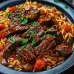 A comforting dish combining tender beef with orzo pasta in a rich tomato sauce, perfect for family gatherings or cozy dinners.