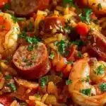 A comforting one-pot dish that combines bold flavors from smoky sausage, tender chicken, and plump shrimp with rice and Creole spices.