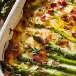 If you’re tired of the same steamed or roasted asparagus and want something that feels like a special occasion without much fuss, this casserole is perfect because it adds creamy, savory richness and a crispy top while staying keto-friendly. The sauce is a comforting, velvety blend of cream cheese, heavy cream and three melting cheeses, and the beef bacon brings smoky crunch—together they elevate humble asparagus into a dish that works as both side and simple main.