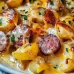 A comforting meal featuring tender potatoes, savory smoked sausage, and oozy cheese, perfect for busy weeknights or gatherings.