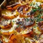 A cozy, layered casserole of winter root vegetables under a cheesy sauce, perfect for holiday meals or as a comforting side dish.