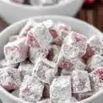 This recipe follows the classic “muddy buddies” or puppy chow framework: coat a sturdy cereal in a sweet, chocolate-peanut butter mixture, then dust with powdered sugar. Here the flavor profile shifts to cherry cheesecake by using white chocolate and cherry juice, plus the crunch and flavor of graham cracker crumbs.