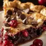 A cozy dessert featuring warm cherries and pockets of melted chocolate in a flaky crust, perfect for family dinners and potlucks.
