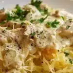 Chicken Alfredo Spaghetti Squash offers the creamy comfort of Alfredo without the heavy carbs of traditional pasta, making weeknight dinners feel a little lighter and a lot cozier. Tender slow-cooked chicken falls into delicate strands amid roasted spaghetti squash, all bathed in a rich Parmesan and cream sauce — a satisfying, low-carb twist on a classic favorite. If you enjoy casseroles with a creamy finish, you might also like this high-protein Chicken Alfredo bake for another take on creamy chicken comfort food.