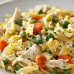 A quick and comforting one-pan chicken pot pie noodle skillet that is easy to prepare and packed with flavor.