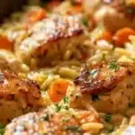 A comforting twist on traditional pot pie, this Chicken Pot Pie Orzo features tender chicken, garden vegetables, and creamy broth with orzo pasta for a quick and satisfying weeknight meal.