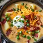 A warm, creamy soup that combines the flavors of a loaded baked potato into one comforting dish.