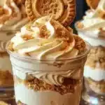 A playful twist on classic cheesecake, these no-bake Cookie Butter Cheesecake Cups layer spiced Biscoff crumbs with a silky cookie-butter mousse, perfect for parties or solo treats.