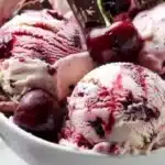 A nostalgic no-churn ice cream featuring juicy cherry swirls and dark chocolate bits, perfect for warm days.