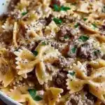A delightful pasta dish combining rich beef, creamy garlic, and Parmesan sauce with bowtie pasta, perfect for family dinners and gatherings.