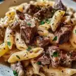 Keywords: creamy pasta, steak pasta, Italian dinner, pasta recipe, comfort food