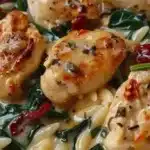 A rich, one-pot Italian-inspired comfort dish featuring creamy orzo pasta, seared chicken, and vibrant sun-dried tomatoes and spinach.