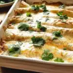 Indulge in these creamy white chicken enchiladas, enveloped in a rich sauce and baked to perfection, perfect for family feasts or cozy dinners.