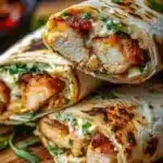 Delicious and quick meal option, perfect for lunch or dinner, featuring seasoned chicken, gooey mozzarella, and fresh spinach wrapped in a tortilla.