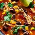 This soup balances the smoky, tangy notes of enchilada sauce with the earthy depth of cumin and the mild sweetness of corn and tomatoes. Black beans add heft and a creamy bite when mashed slightly, while the shredded chicken provides the main protein and soaks up the seasoned broth. The melty cheese ties the elements together, and tortilla chips give the necessary crunchy contrast. Fresh cilantro and a squeeze of lime at the end brighten the whole bowl and cut through richness.