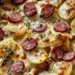 A lazy chef’s dream, this classic casserole layers frozen pierogies, smoky kielbasa, and a creamy cheddar sauce for a comforting meal.