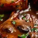 Slow-cooked pork chops in a savory mushroom gravy, perfect for a comforting family meal.
