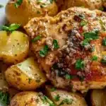 A warm, creamy, and savory slow-cooked dish featuring tender chicken and baby potatoes in a delicious garlic-Parmesan sauce.