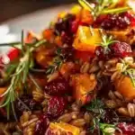 A vibrant farro salad featuring roasted butternut squash, cranberries, and crunchy nuts, perfectly balanced with a tangy dressing.