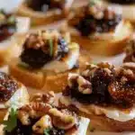 Warm and festive, these Fig & Brie Crostini combine crispy baguette, creamy brie, sweet fig jam, and crunchy walnuts for an elegant holiday appetizer.