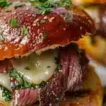After the resting period, use your serrated knife to separate the individual sliders by cutting along the lines. Arrange the warm, cheesy sliders on a serving platter. Pour the hot au jus into small bowls for dipping, or into a larger bowl for sharing. Garnish with fresh chopped parsley if you like and serve immediately to enjoy every savory bite!