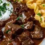 If you’re tired of thin, tomato-heavy stews that lack body and comfort, this recipe is perfect because it balances savory beef, sweet onion, and the warmth of paprika into a creamy, luscious sauce that clings to noodles, spaetzle, or mashed potatoes. It’s a smart choice when you want something impressive without complicated technique: sear, simmer, and finish — the slow cooking does the heavy lifting.
