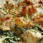 A friendly, creamy baked casserole that turns classic spinach-artichoke flavors into a high-protein weeknight winner. Packed with shredded chicken, Greek yogurt and melty cheeses, it’s the kind of dish that reheats well and keeps everyone satisfied. If you enjoy easy, comforting casseroles, you might also like this similar spinach cream cheese chicken casserole for another creamy option.