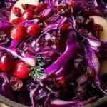 A festive and colorful slaw that combines crunchy red cabbage, sweet apples, and tart cranberries, perfect for any holiday spread.