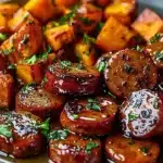 - The contrast of textures and flavors between the tender sausage and crispy sweet potatoes makes every bite sensational.