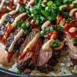 A delicious and comforting Korean BBQ Steak Rice Bowl featuring marinated steak, fluffy rice, fresh vegetables, and a spicy cream sauce.