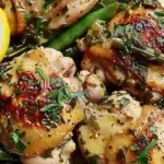A simple yet fancy one-pan dish with crispy chicken thighs, fresh green beans, and a zesty lemon garlic butter sauce.
