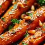 Serve the carrots on a warm platter to maintain temperature; scatter toasted nuts and crumbled cheese on top just before placing on the table. A light sprinkle of flaky sea salt at the end heightens the flavors and keeps the sweetness from feeling cloying. Fresh herbs—parsley, chives, or tarragon—add a bright finishing note and color contrast.