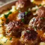 Texture and balance are the keys to this dish. If your mashed potatoes are too stiff, add a little more milk or cream warmed first; if too loose, fold in a small handful of instant mashed potato flakes or a tablespoon of flour to firm them up. For a richer flavor, brown a small shallot or more onion in the skillet before making the gravy and deglaze with a splash of red wine (let it reduce slightly) before adding the broth. When shaping meatballs, wet your hands with cold water to prevent sticking and keep sizes uniform for even cooking.