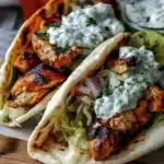 Delicious and easy-to-make Mediterranean Chicken Gyros featuring marinated chicken thighs and creamy feta tzatziki.
