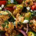 A vibrant one-skillet dish featuring tender chicken, colorful vegetables, briny olives, and tangy feta, perfect for quick weeknight dinners.
