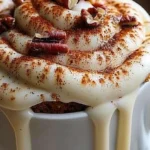 Spoon or drizzle the prepared cream cheese frosting generously over the warm rested mug cake. The warmth will cause it to melt slightly creating a gooey texture. Pro tip let it melt just a bit to mimic fresh cinnamon roll glaze.Optional Garnish