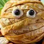 A playful appetizer that looks like a mummy and tastes delicious, perfect for Halloween or any gathering.