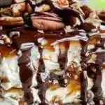 6. Before serving, drizzle generously with the remaining caramel sauce and chocolate syrup. Sprinkle with the remaining chopped pecans. For clean slices, dip a sharp knife in hot water and wipe clean between each cut. Slice and serve cold.