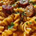 A cozy, creamy pasta made in one skillet with smoked sausage, rotini, and Cajun spice in a silky tomato-cream sauce. Perfect for busy weeknights!
