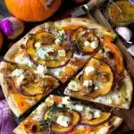 A delightful dish featuring a crispy thin crust topped with savory pumpkin, creamy feta cheese, and herbs, perfect for fall gatherings.
