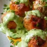 - Serve: Plate the warm salmon balls with a generous drizzle or dollop of the creamy avocado sauce and garnish with extra chopped herbs and a wedge of lime.