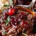 A comforting slow-braised beef roast with a rich cranberry balsamic glaze, perfect for gatherings and cozy dinners.