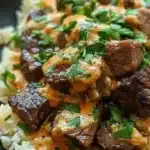 - Q: Can I bake this as a casserole? A: Yes—layer rice, steak, and queso in a baking dish, top with extra cheese, and bake at 350°F (175°C) until bubbly.