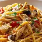 A cozy and creamy crockpot chicken spaghetti that combines chicken, creamy soups, and cheeses for a comforting, easy dinner perfect for busy weeknights.
